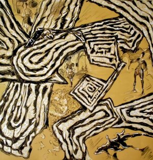 The first man's application in the field of geometry have been the agricoltural land divisions into lots along the banks of the Nile River. Mario Prencipe during his travels noticed that lots of certain remote areas retain some original geometric shapes concept. On behalf to describe some places than the artist creates abstract compositions made of geometric elements inspired by the applied designs of local lotings.