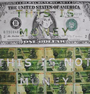 This work come from an experience lived in Zimbabwe: when I arrived in the house, I was told that changing money at black exchange would be much cheaper than the legal one, even if punishable by ten years of prison, we proceeded with the secret change, and after receiving a large amount of banknotes in change of few dollars, jokingly I say: I received a lot in change of a little, and the man replies: "This is Money, This is not Money". This reply originated the idea of this work consisting of several Zimbabwean dollars and a American dollar drawn, reporting the phrase in question, which places attention on the meaning of money and on the relativity of its value. Looking deeper into the meaning of this work, note that the writings were made with banknote clippings and the "This is Money" was cut out of the American dollar, but was affixed to the Zimbabwean dollar, the "This is not Money" cut out from the Zimbabwean dollar, was affixed to the American dollar. In this case the question is : what does the phrase refer to? to the clipping with which the writing was obtained or to the base on which it was placed? This ambivalence of meaning corroborates the concept according to which the possibilities of interpretation on the reality of the monetary world are articulated and related to geographical, political and ideological factors.
